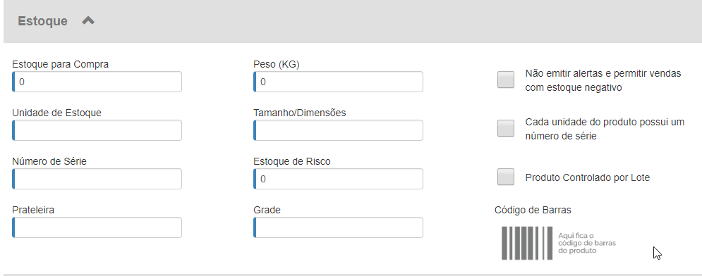 Estoque de risco: defina qual a quantidade de risco para este produto no estoque. Ou seja, o sistema notificará quando será necessário realizar uma nova compra do produto, no relatório de estoque de risco.