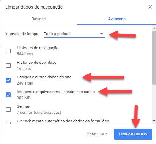Na caixa exibida, a primeira opção serve para você selecionar a quantidade de dados que você deseja excluir. Indicamos selecionar Todo o período para excluir tudo.